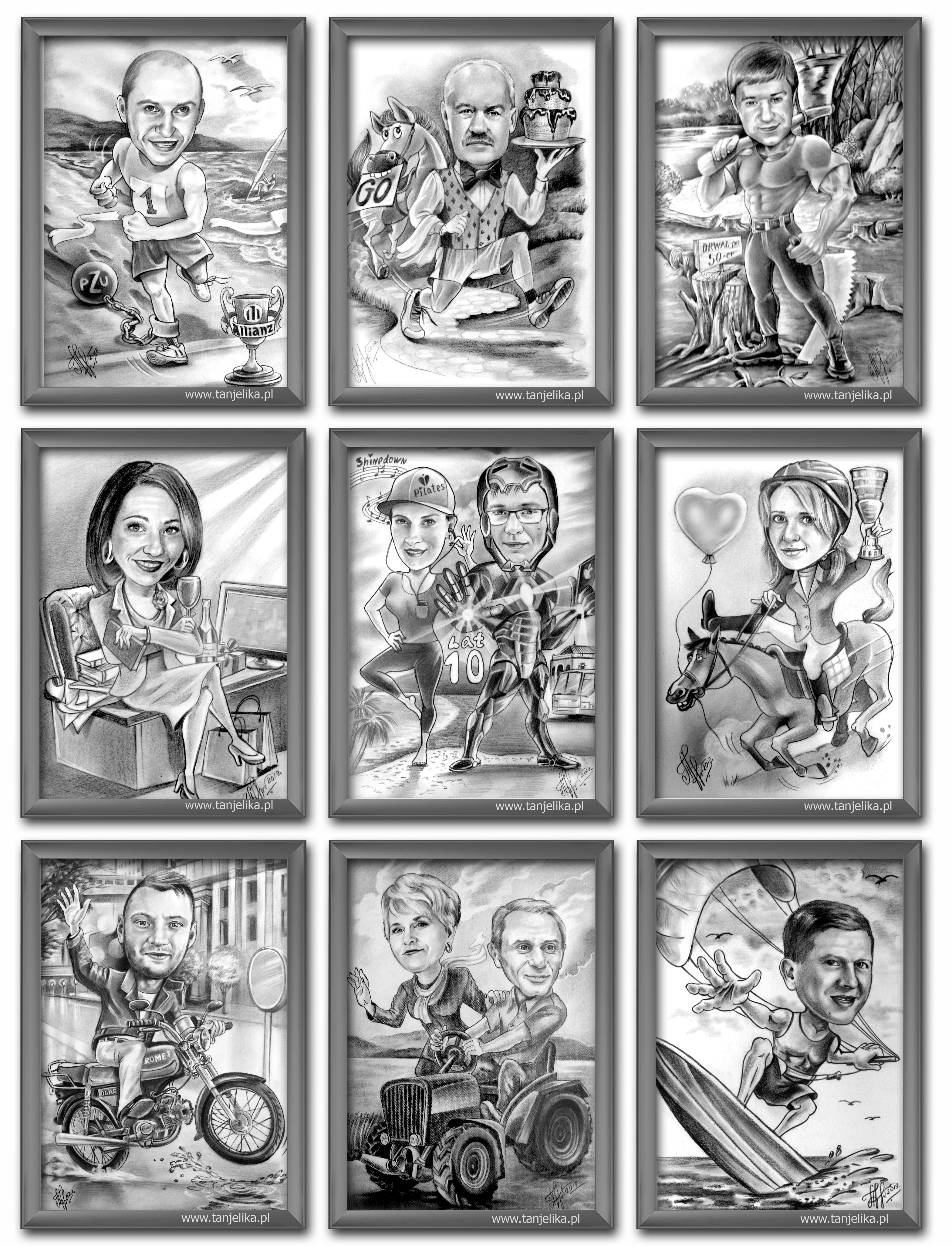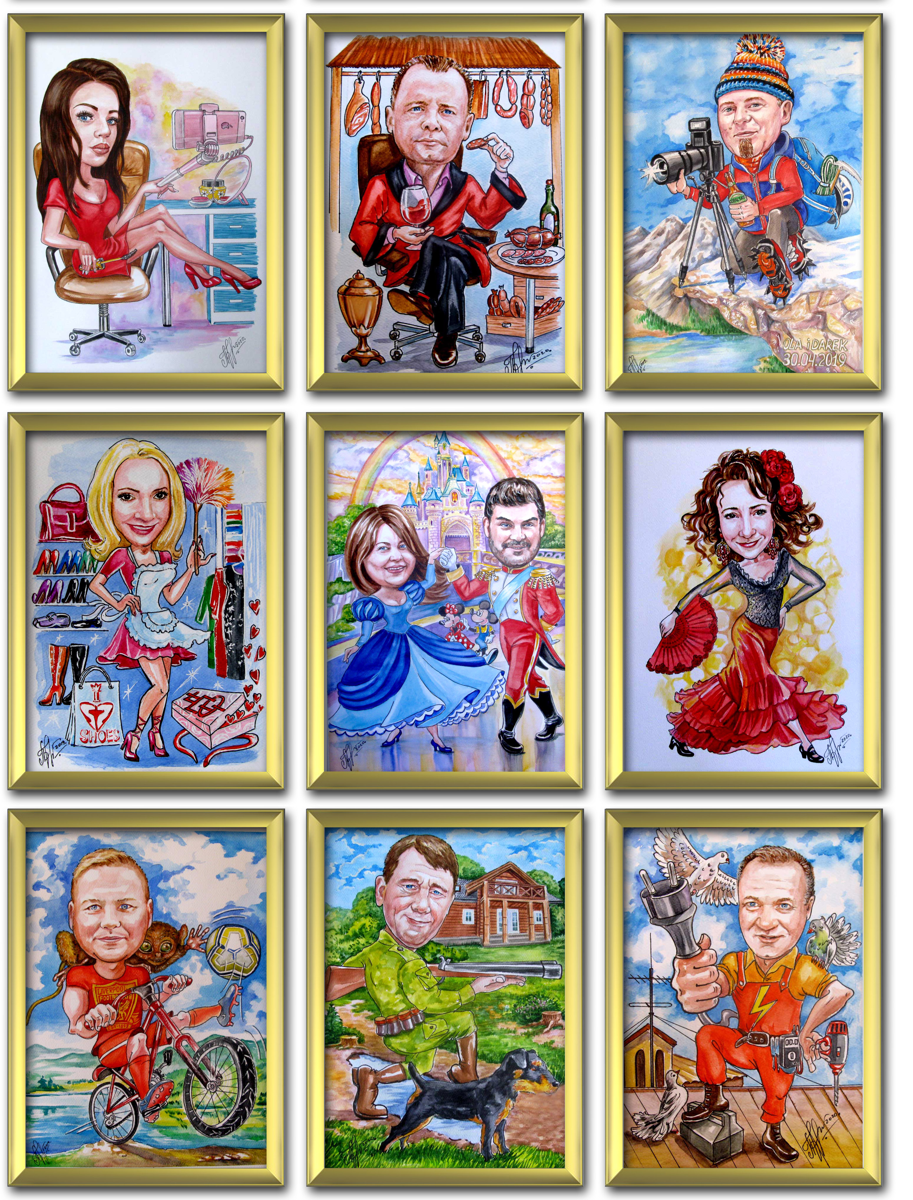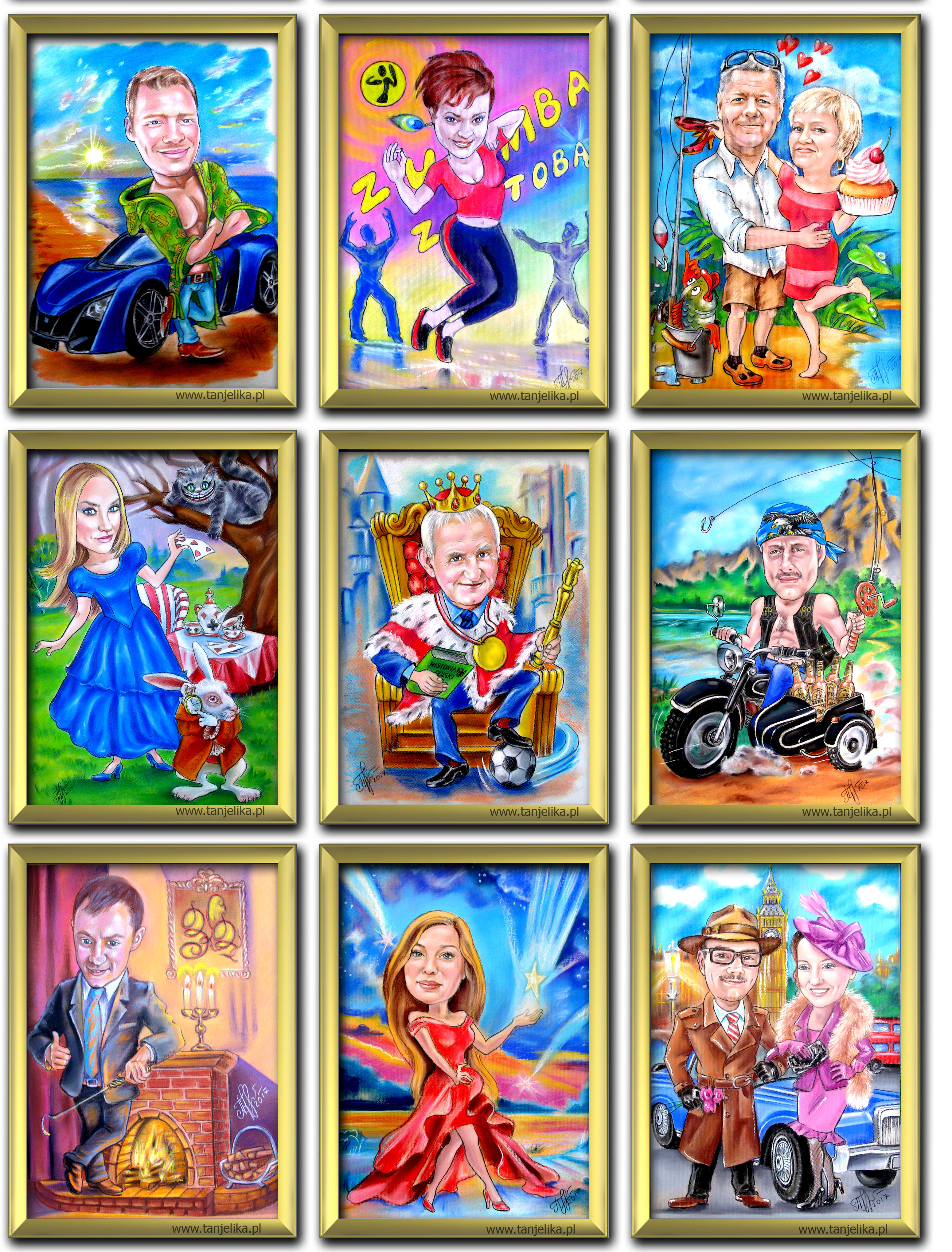 Wszystkie malowane przeze mnie karykatury są wykonywane ręcznie, przy pomocy ołówka, farby akwarelowej lub farby olejnej. Przed przystąpieniem do pracy staram się poznać cechy rysowanej postaci, jej zainteresowania, czy też znaki szczególne. Pomaga mi to stworzyć karykaturę, która będzie wiernym odbiciem danej osoby. Oczywiście będzie to odbicie w krzywym zwierciadle, z dużą dozą humoru oraz ciekawym tłem. Karykatura taka jest doskonałym prezentem dla bliskiej osoby w dowolnym wieku.